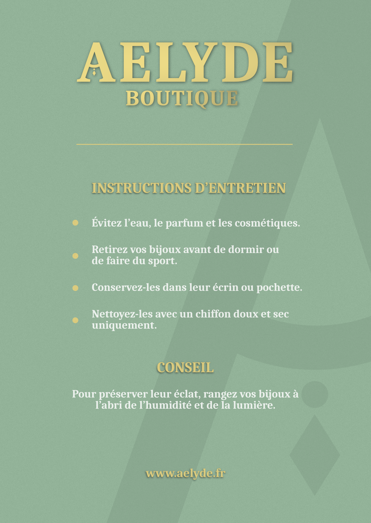 Pour vous accompagner dans ces gestes, un guide d’entretien est glissé dans chaque commande. Véritable grimoire de poche, il récapitule tous les secrets nécessaires pour faire durer la magie de votre bijou au fil des années.